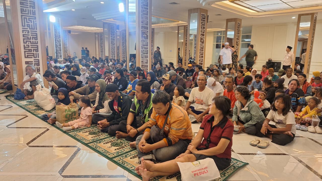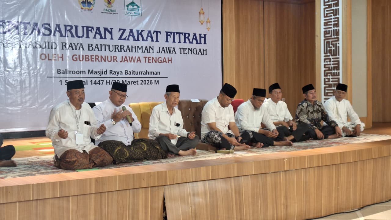 Panitia Amalan Ramadan Masjid Raya Baiturrahman membagikan zakat fitrah pada malam Idulfitri 1447 H. (20/3/2026) di Masjid Raya Baiturrahman, Jl. Pandanaran 126 Semarang. Ribuan kaum duafa sejak magrib mulai berdatangan memenuhi Ballroom Baiturrahman.
