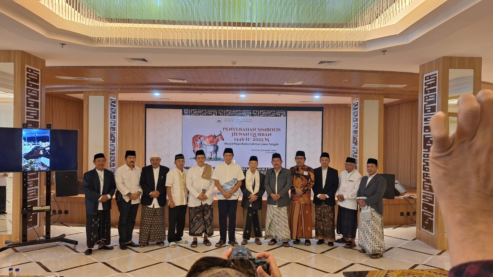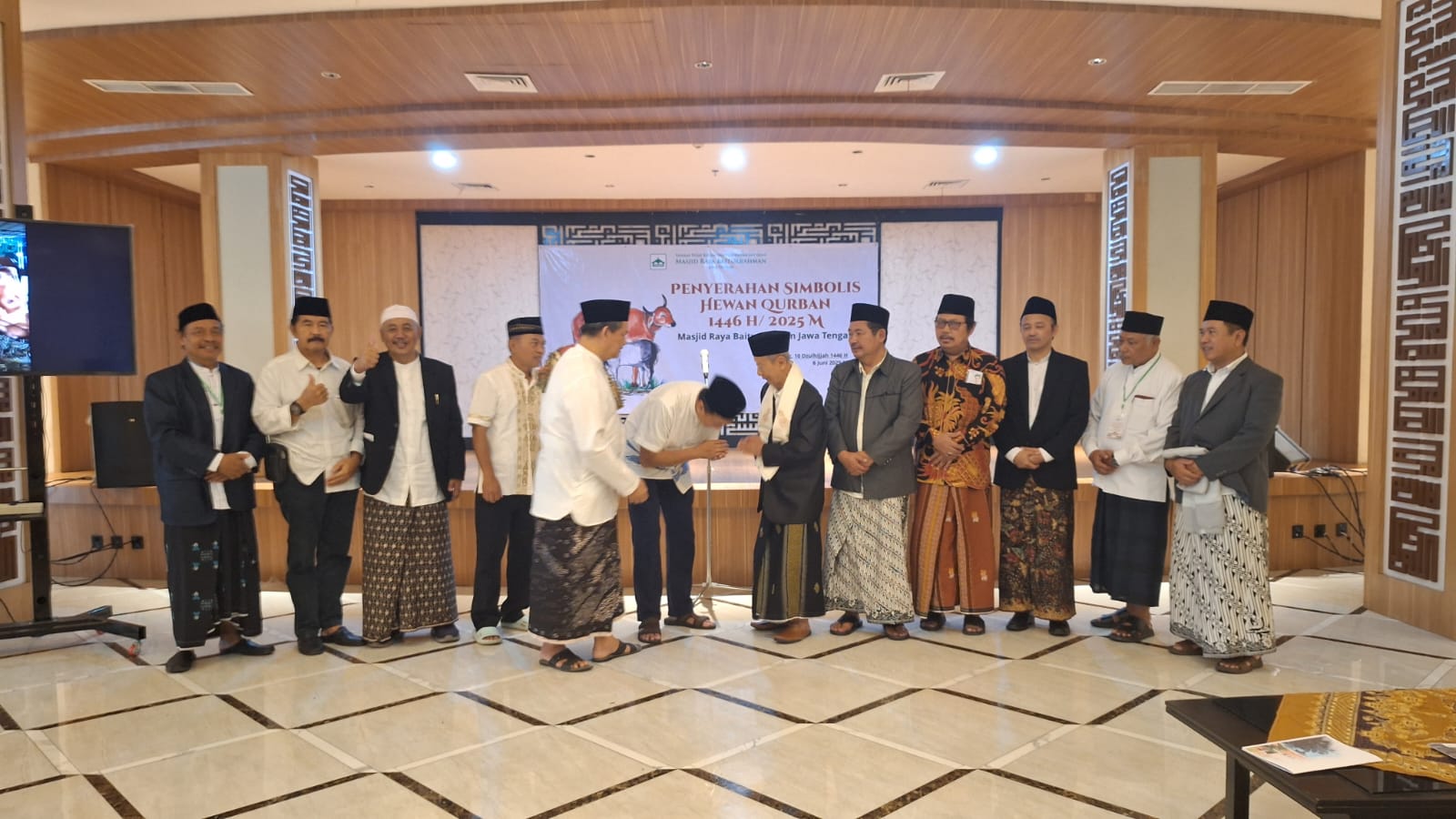 Penyerahan hewan qurban secara simbolis dilakukan di Ballroom Masjid Raya Baiturrahman, Jalan Pandanaran 126 Semarang, Jumat (6/6/2025). Dalam kesempatan tersebut Gubernur Jawa Tengah diwakili oleh Asisten Pemerintahan dan Kesejahteraan Rakyat, Iwanuddin Iskandar menyerahkan hewan qurban secara simbolis dan diterima oleh Ketua Umum YPKPI Masjid Raya Baiturrahman Jawa Tengah, Dr. KH. Ahmad Darodji, M.Si.