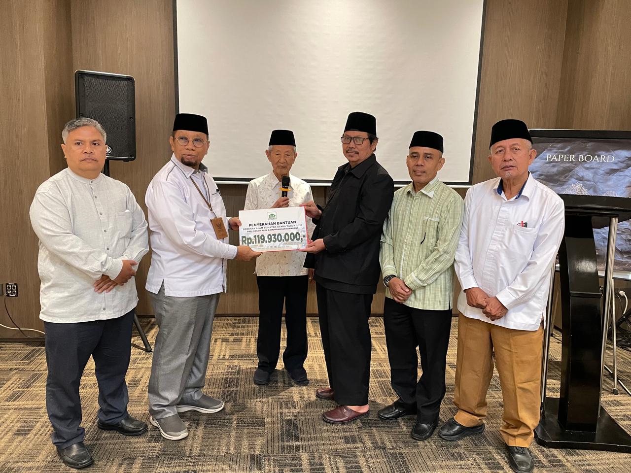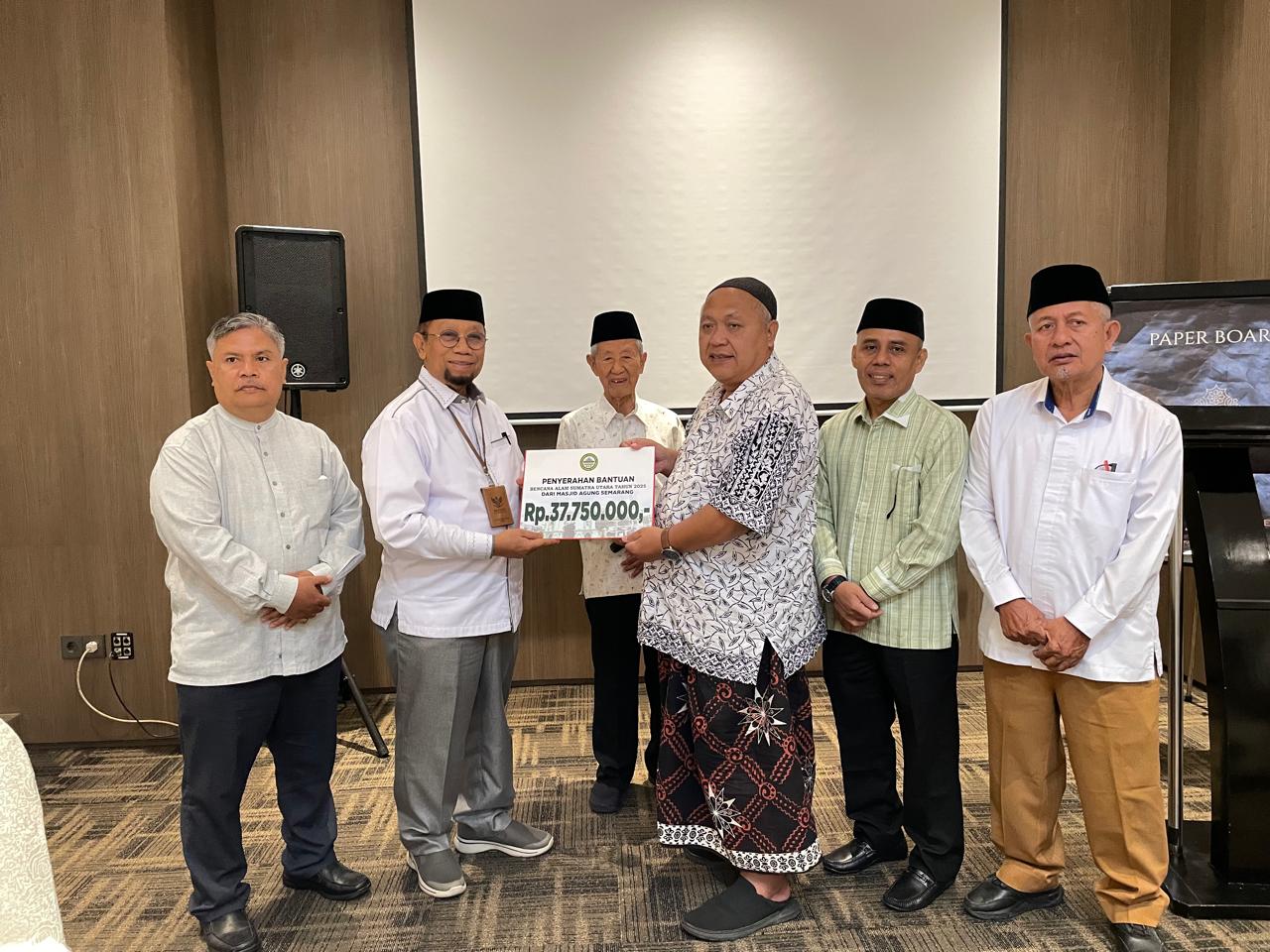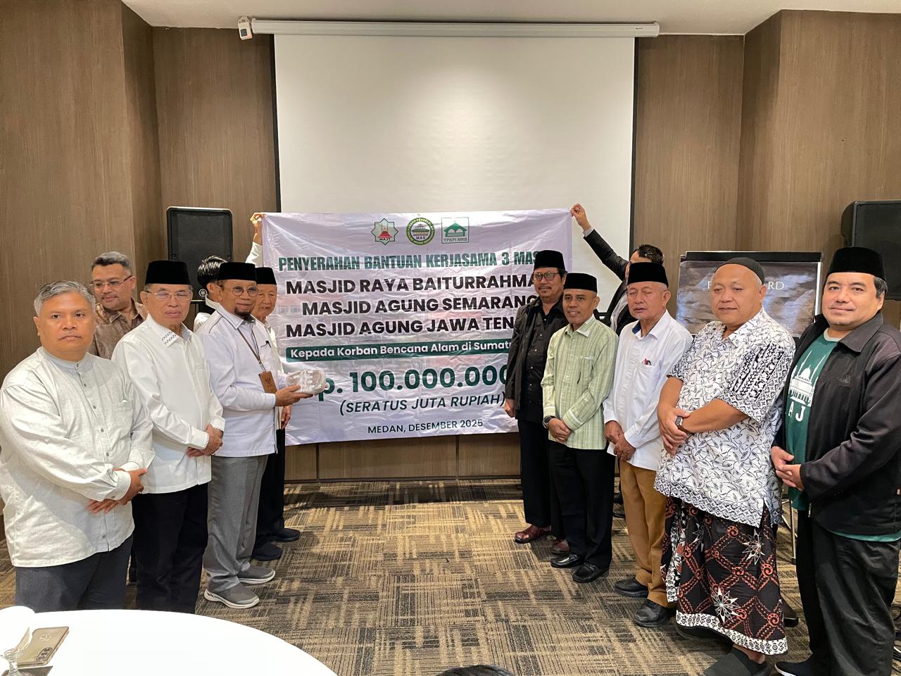 Masjid Raya Baiturrahman (MRB) Jawa Tengah bersama Masjid Agung Jawa Tengah (MAJT), dan Masjid Agung Semarang (MAS) menyerahkan bantuan kemanusiaan kepada korban bencana alam di Provinsi Aceh, Sumatera Utara, dan Sumatera Barat, Selasa (9/12/2025).